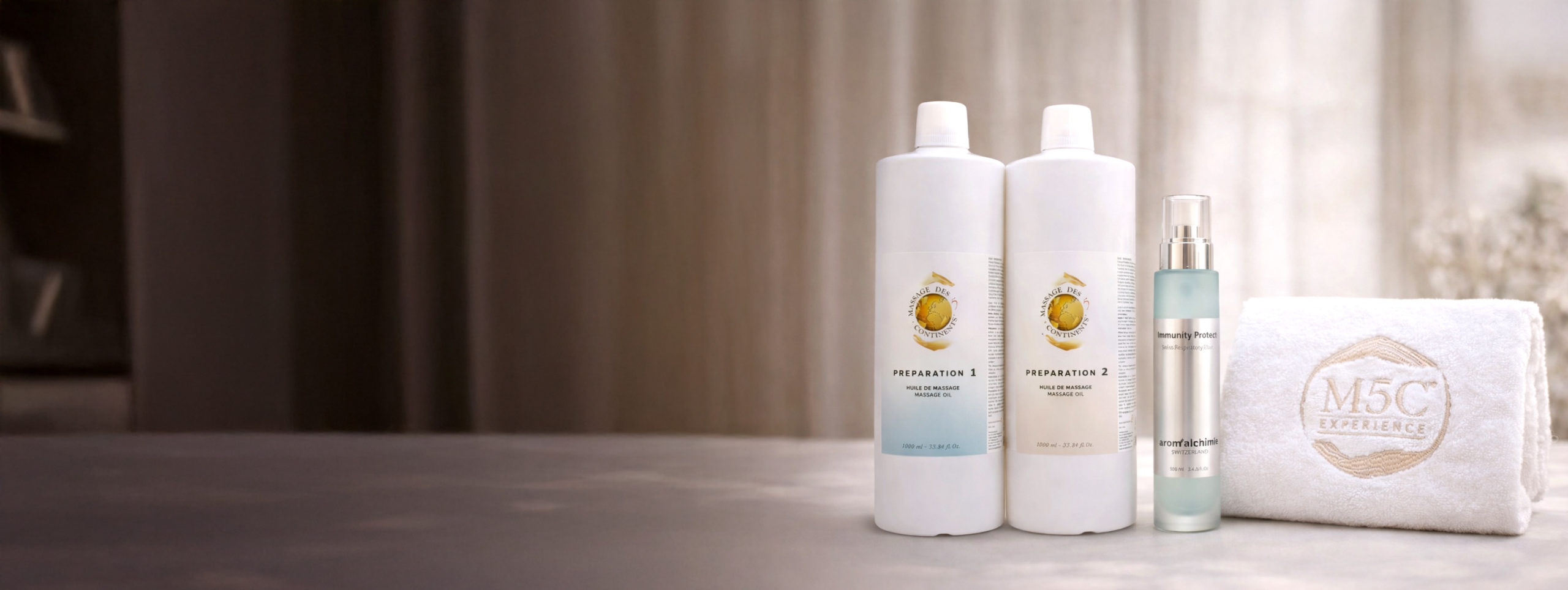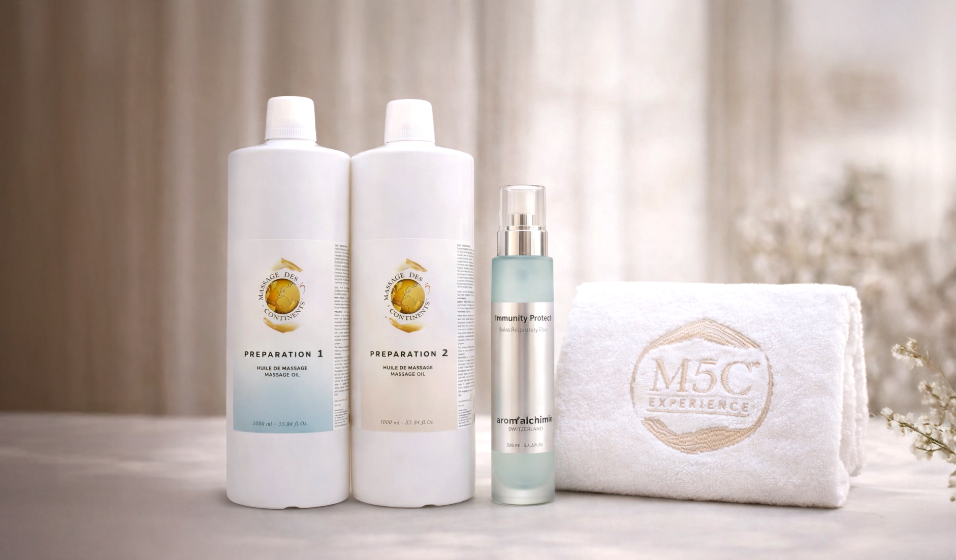 Offrez un massage professionnel avec un coffret complet incluant les huiles M5C – 1&2 (1000 ml), ainsi que Immunity Protect (69€ HT) et une serviette M5C (25€ HT) OFFERTS.